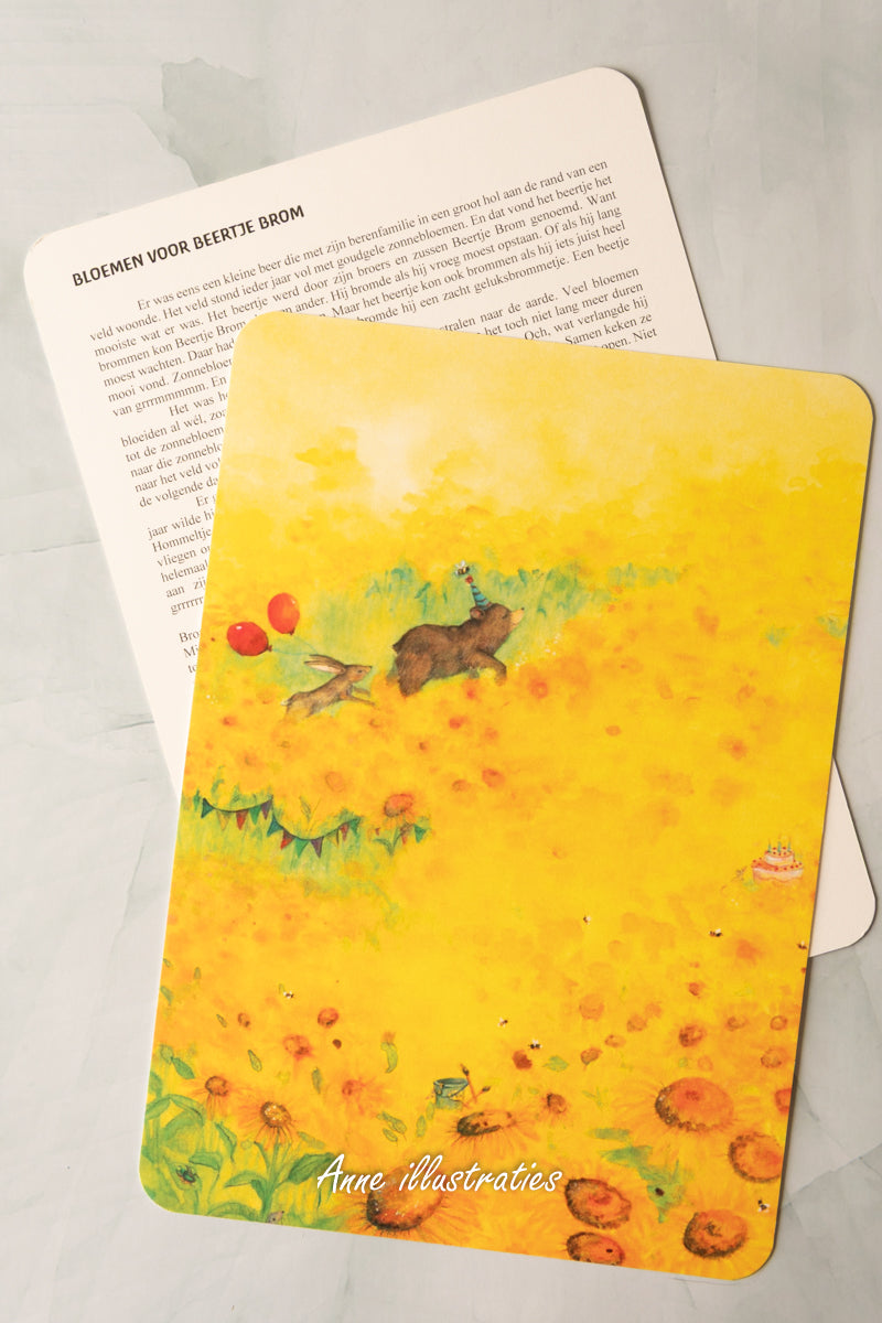 De nazomerkaart vertelt het verhaal over Beertje Brom. Aan het einde van de zomer bloeien alle zonnebloemen, behalve in zij veldje. Beertje Brom is bijna jarig en hoopt vurig dat de bloemen zullen bloeien op zijn feest. Samen met zijn vrienden Hommeltje en Haas doet hij er alles aan om er achter te komen wat er aan de hand is. Zijn geduld wordt flink op de proef gesteld…