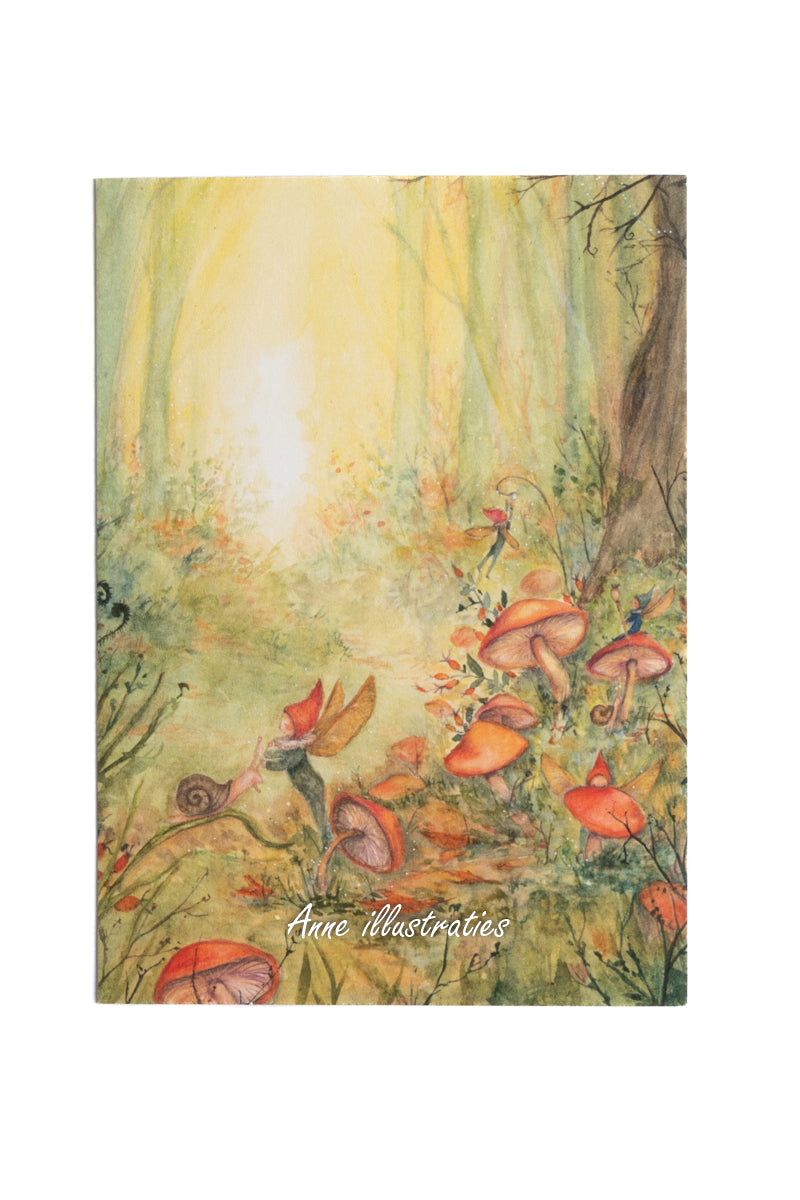 Stap binnen in een wereld waar de herfst haar geheimen fluistert tussen vallende bladeren en zonnestralen die dansen door het bladerdak. In deze illustratie ontdek je een betoverend tafereel: kleine magische wezens verschuilen zich tussen paddenstoelen, bladeren en het warme licht van de zon.