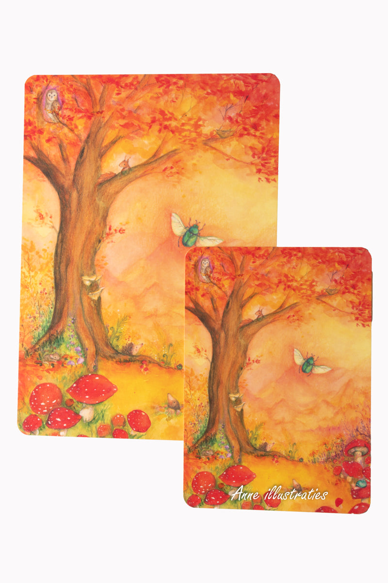 Deze herfstkaart gaat over een groot avontuur. De boom van Saartje Tor kleurt in het najaar rood en oranje. Maar de tor woont diep onder de grond, tussen de wortels, en ziet de wereld eigenlijk nooit. Op een nacht droomt ze dat ze kan vliegen en besluit ze om op reis te gaan, helemaal naar het topje van haar boom. Als ze daar aankomt gebeurt er iets wonderbaarlijks…