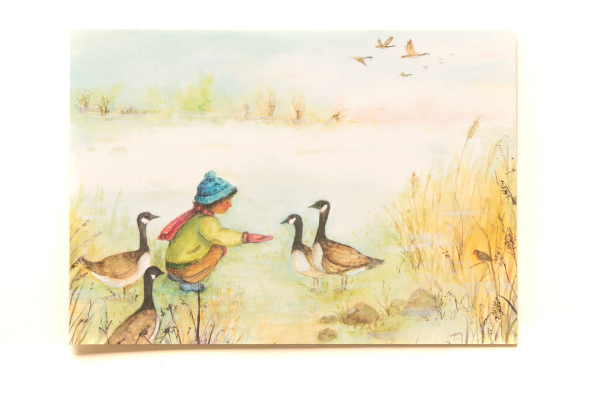 In de kou, bij het stille water, zit een jongetje tussen wilde ganzen. Hij steekt zijn hand uit een gebaar van vertrouwen en verbondenheid. Boven het land hangt een zachte nevel, terwijl in de lucht wilde zwanen hun weg trekken naar verre oorden.
